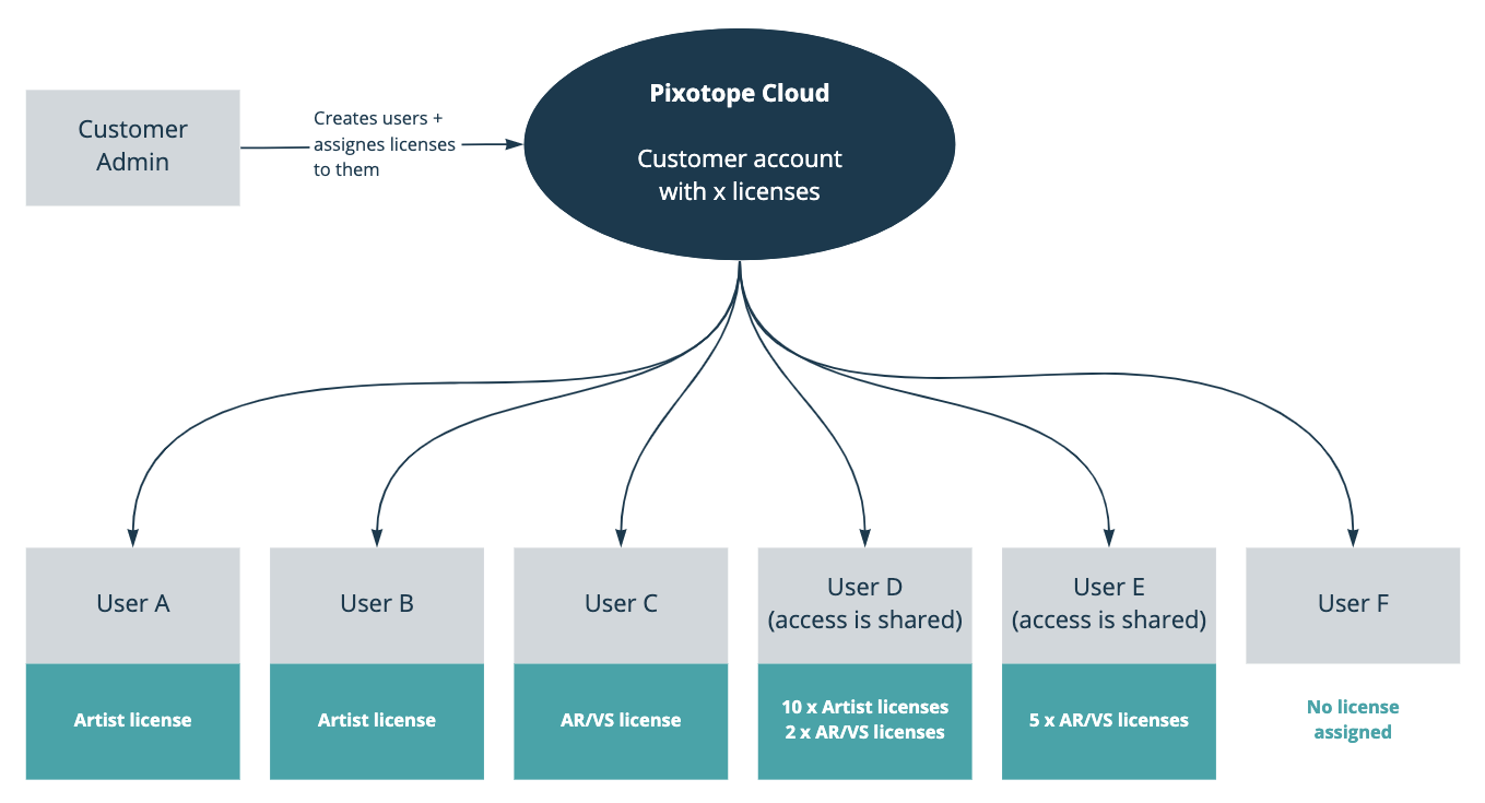 With a single subscription of Pixotope, your account admin will be assigned a specific number of licenses. These can be assigned individually to users.