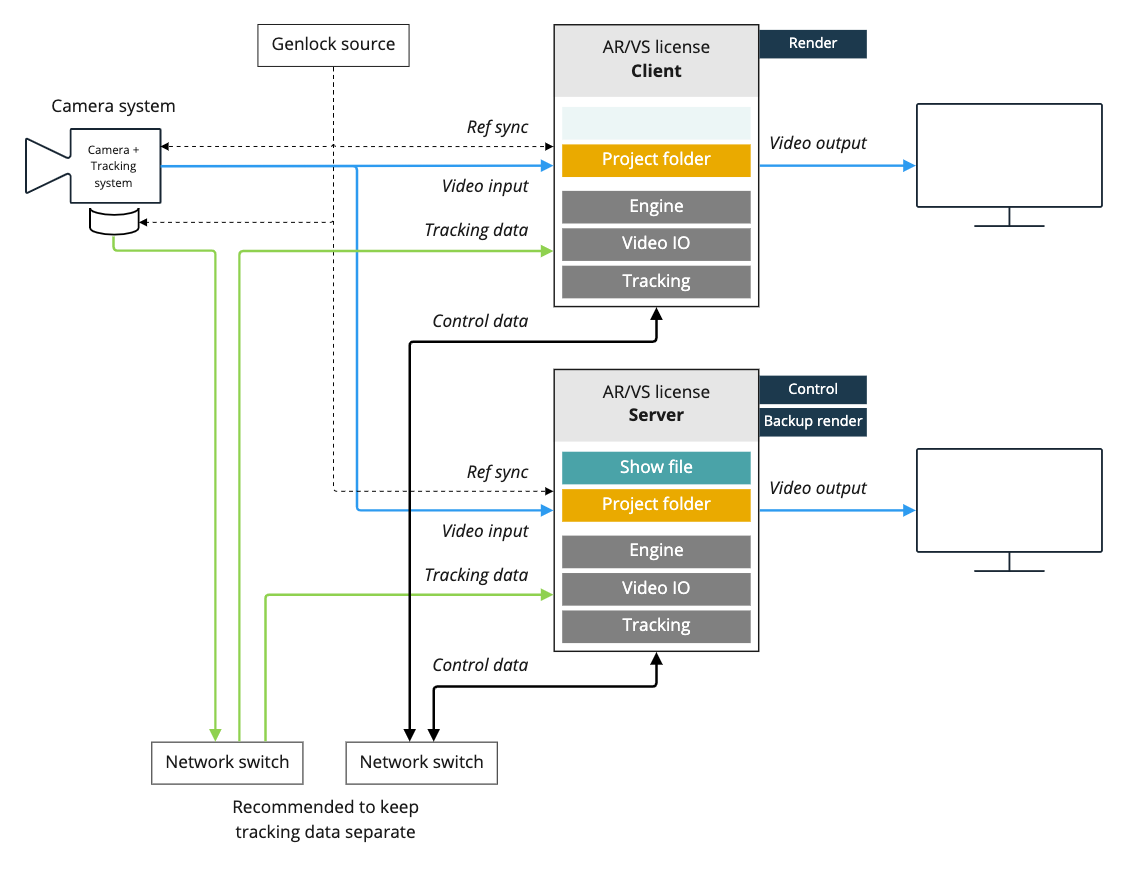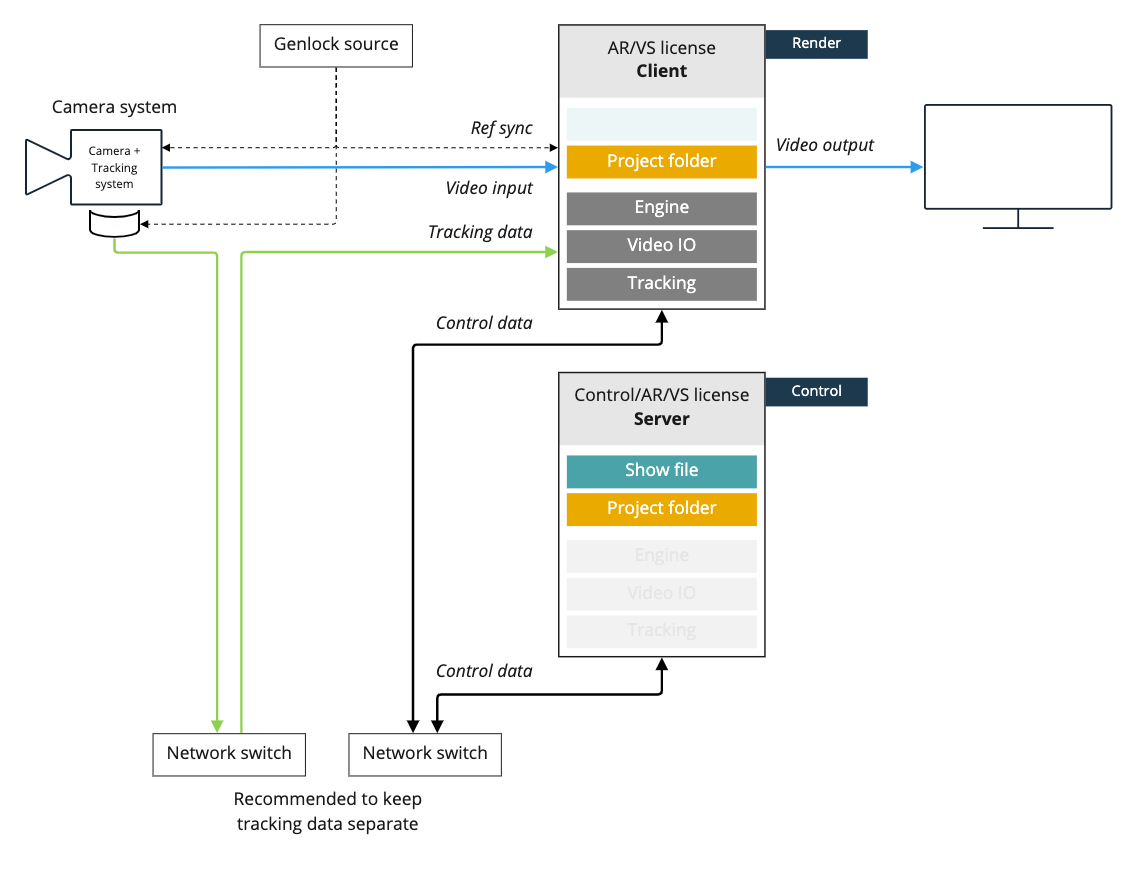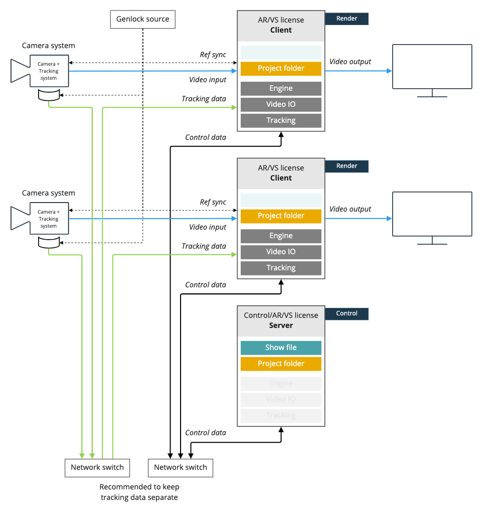 For control or redundancy, more machines can be added. When using more than one machine, Client and Server roles are needed.