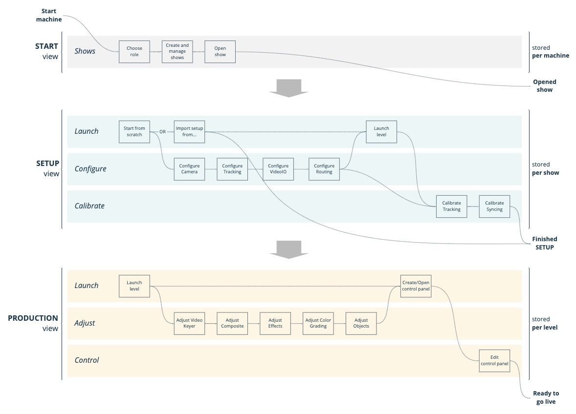Pixotope Director is designed with a virtual production workflow in mind. It is built around the main steps, which are shown in the interface in 3 views. These can be switched in the left side menu:
