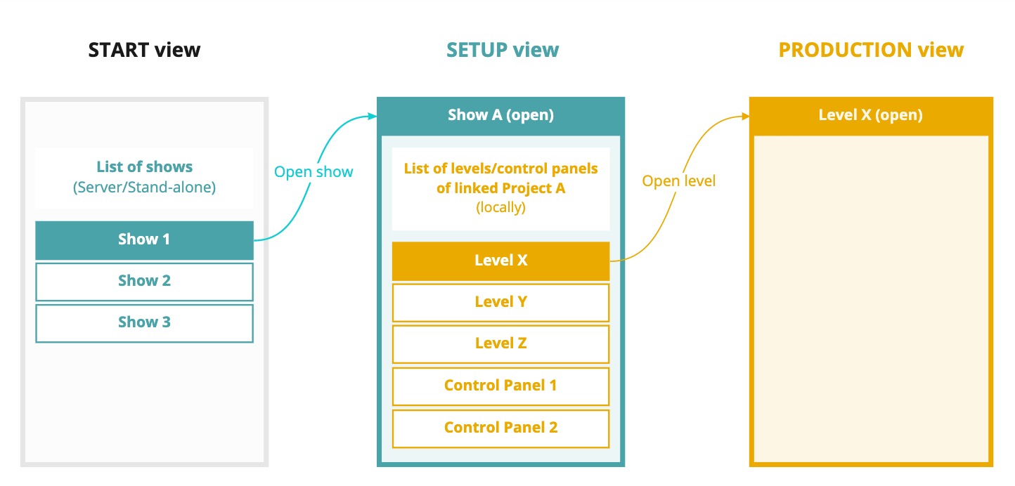 With the introduction of the START view, the SETUP and PRODUCTION views become dedicated to your open show:
