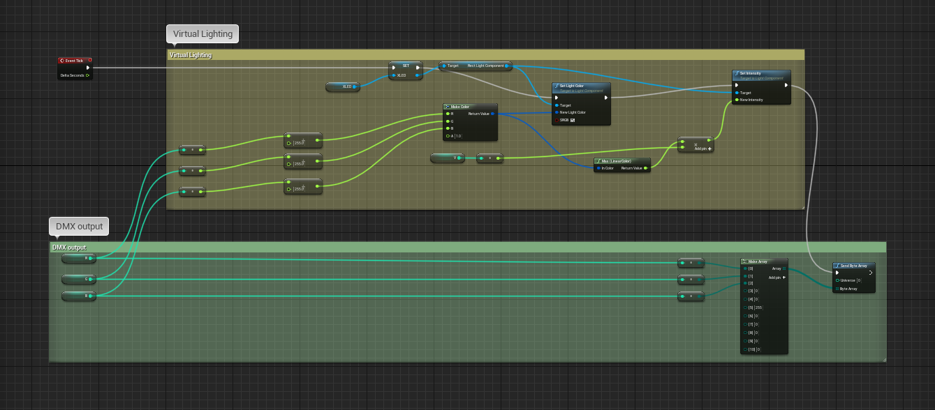 Our Art-Net/DMX implementation is currently able to take any value from Blueprints and forward it as a byte array to individual channels in a DMX universe. The system supports full daisy-chaining and control of multiple fixtures.