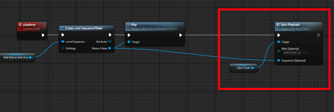 When you play a Level Sequence or Bink media player, you need to call the event “Sync Playback” from the sync tools object and input the Level Sequence player or Bink media player in the relevant input pin of the event: