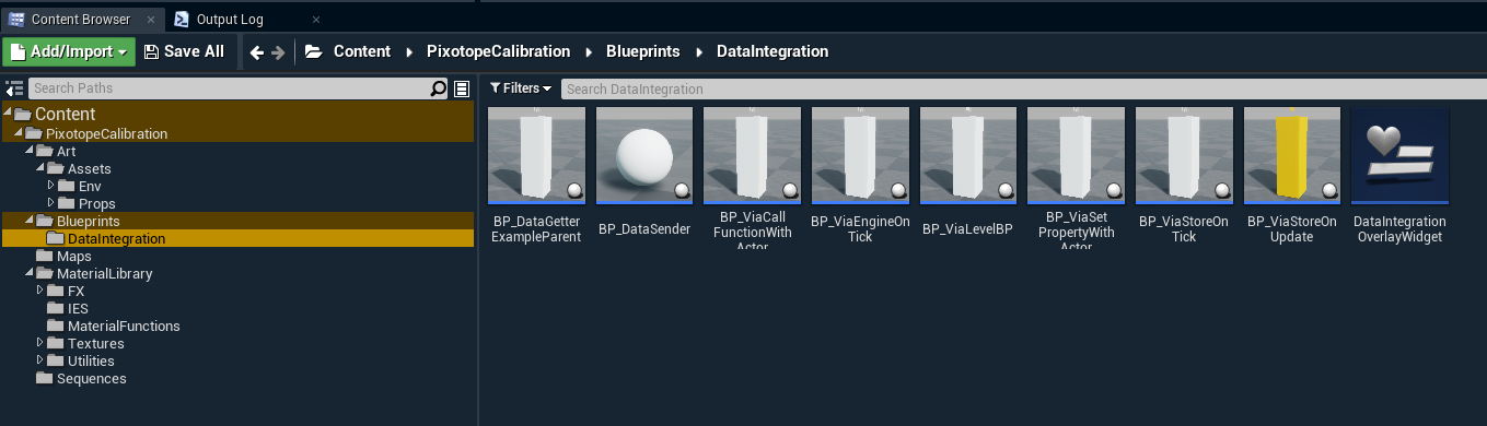 Under Content/PixotopeCalibration/Blueprints/DataIntegration there are all the blueprints used to set up these examples. Additionally there is some logic defined in the level blueprint.