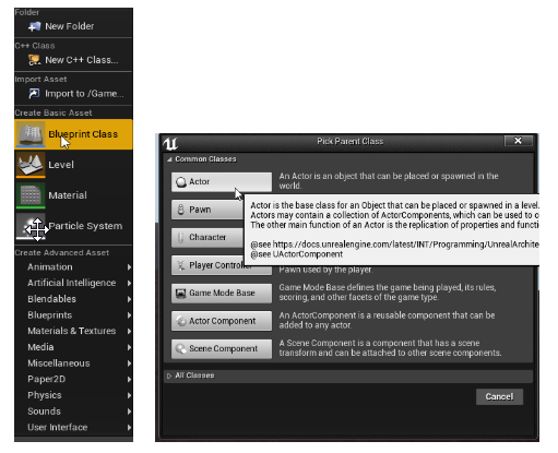 In the Content browser, right-click and create a Blueprint class actor