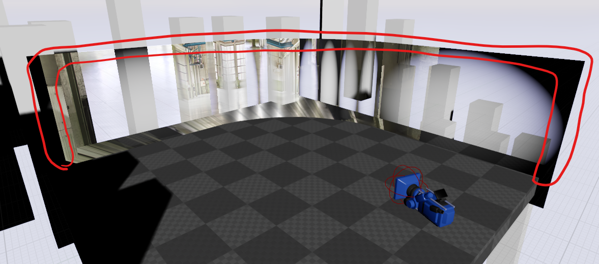 The virtual set extension can be thought of as an AR scene with a hole punched through to the raw camera video in the area occupied by the physical LED screens.