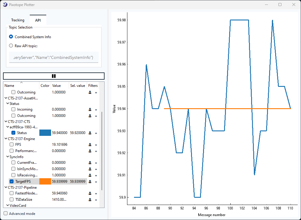 And Pixotope Plotter with which you can inspect all tracking data over time, now also can show any value delivered via the API like for example the FPS of all connected engines.