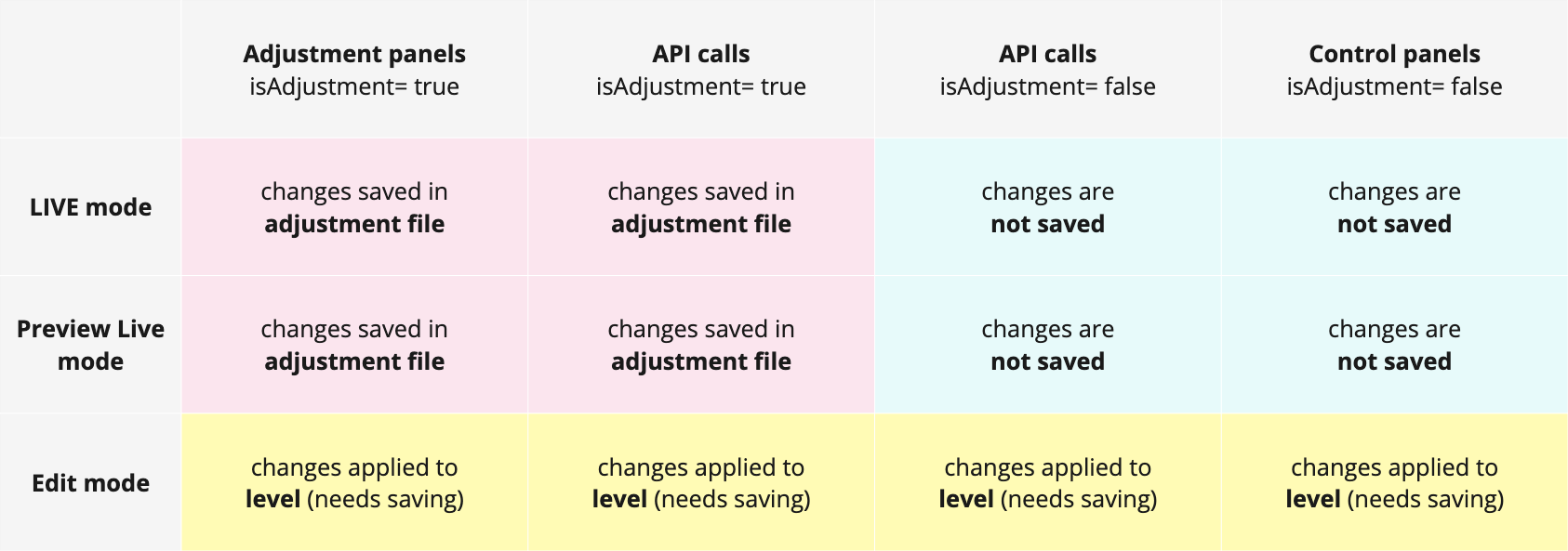 [Project folder]/Saved/Adjustments/[Levelname].adj)Adjustments are automatically "added on top" every time a level with adjustments is launched in LIVE or in Preview Live mode