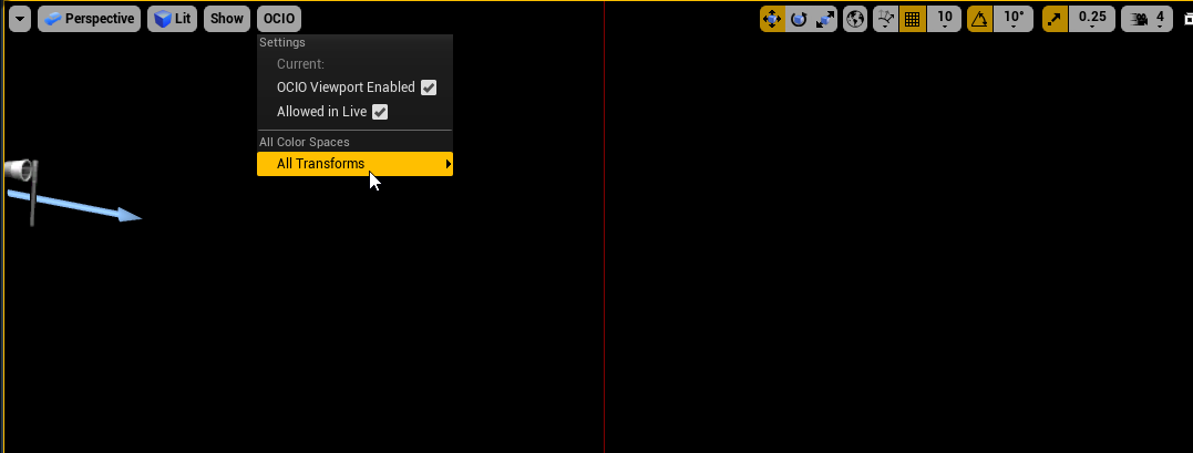 By enabling OCIO viewport and, Allowed in live we ensure that all Unreal viewports also convert the linear image to something more appropriate to show on a monitor. The recommended workflow is to use the configuration from VideoIO to drive the view transformations, but you can also set the viewport to a different color space than your video output to see what the different types of output will look like. This will NOT affect the video output which is managed separately.