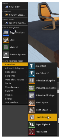 In the Content browser, right-click and create a Level sequence from the "Animation" menu