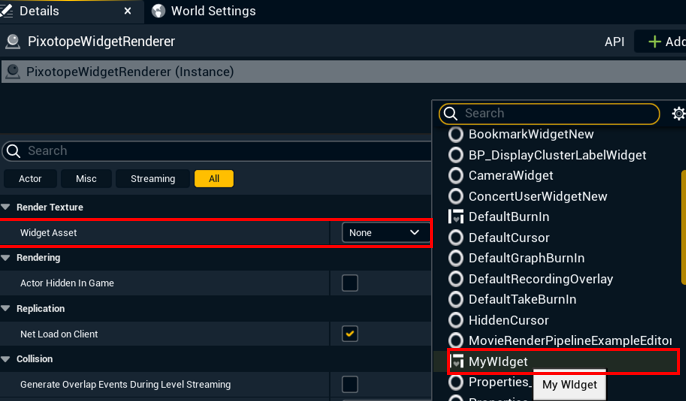 In the Details tab under Render Texture > Widget Asset, assign the widget class you created in step 1