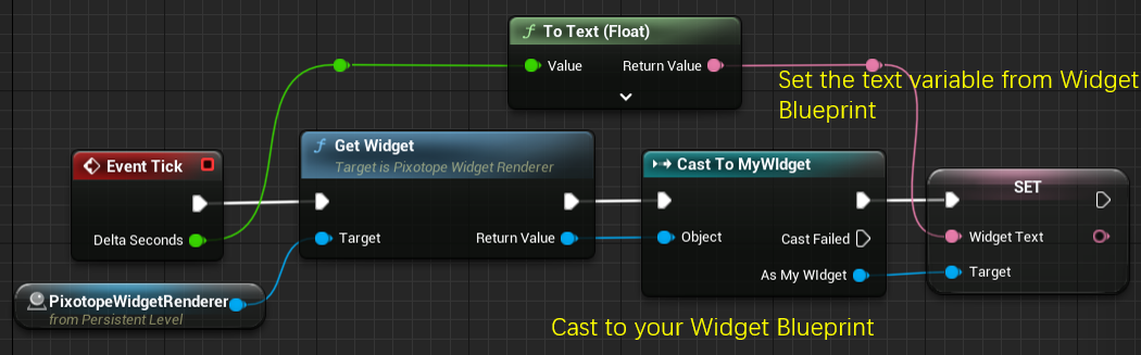 Add a Get Widget node out of your Pixotope Widget Renderer actor and cast it to your MyWidget type