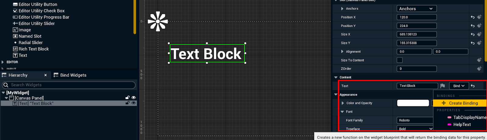 Open MyWidget and add a Text block into the canvas