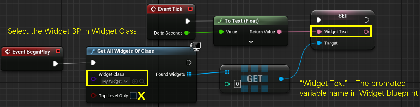 In case you are using a regular blueprint, use the "Get All Widgets of Class" node to get the MyWidget blueprint.