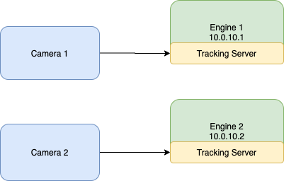 This is the simplest setup, with the fewest sources of problems. Here the Tracking Server must be configured to send tracking to the specific IPs of the engines. It is not possible to reroute tracking from camera 1 to engine 2 without changing the physical cabling.