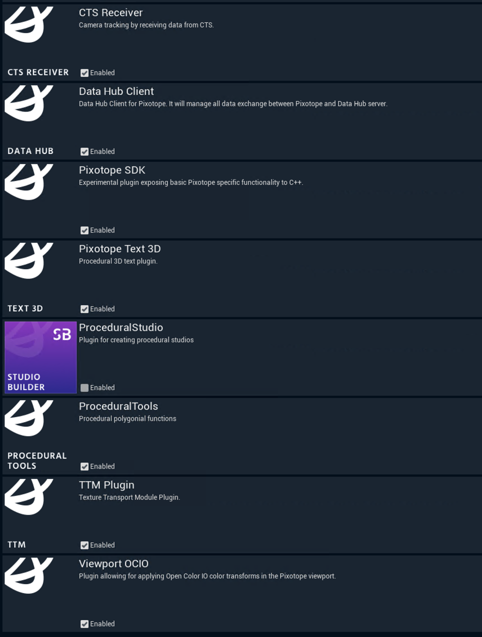 The Pixotope Editor utilizes several plugins to add functionality to the Editor. A list of these can be found under the Pixotope Editor > Edit > Plugins > Built-in > Pixotope.