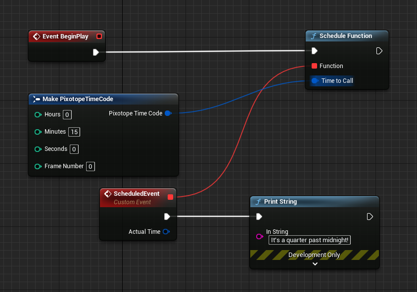Using Schedule Function Blueprint you can define a logic that is to be executed at a given timecode (or right when Engine receives an equal or higher timecode, to be precise).