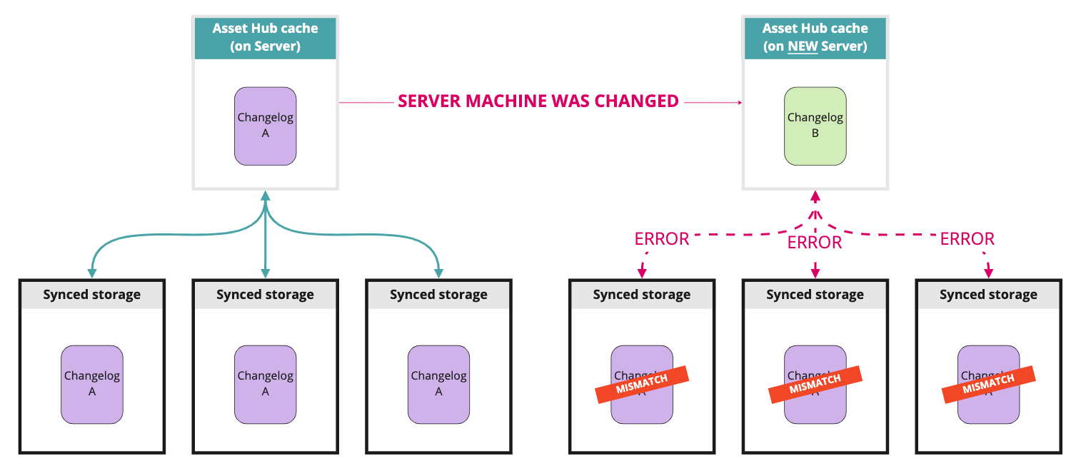 In case the changelog of the Asset Hub cache does not correspond to the one of the connected machines, pushing or pulling changes will result in an error due to a mismatch of their "history".