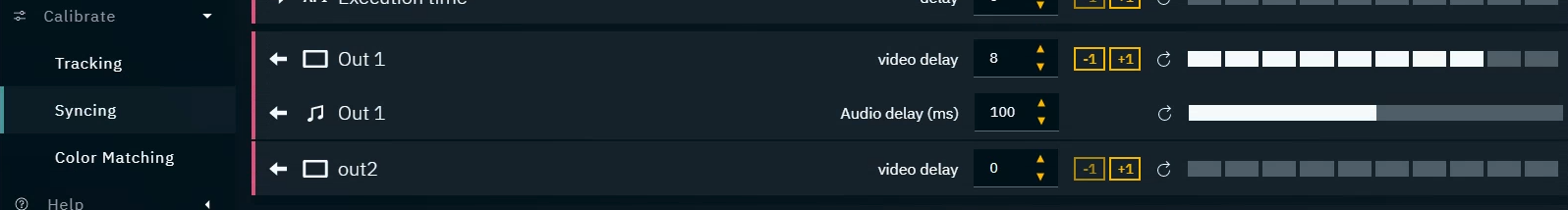 Audio delay should be approximately the same as the video output delay e.g. for 2 frames video output delay at 59.94Hz, set the audio delay to 33 msec; for 3 frames at 50Hz, set to 60 msec. The minimum delay should be 10-15 msec.