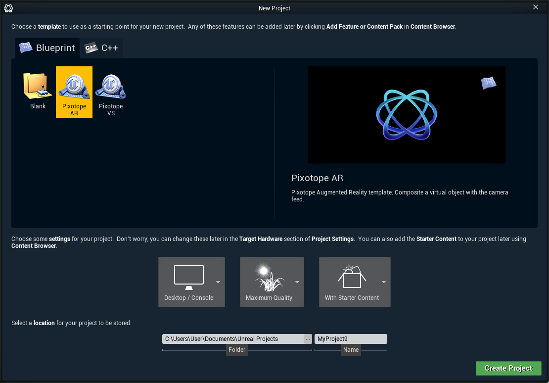 Select on of the templates (AR, VS or XR)