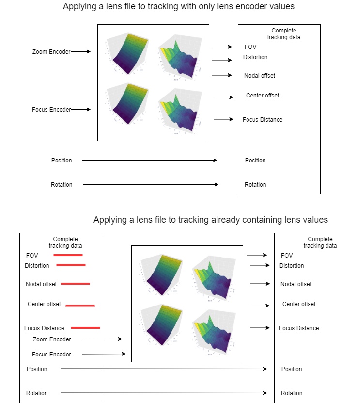 Lens files convert physical lens information (the rotation of the zoom and focus rings on the lens barrel) to calibrated lens values. The position is generated by encoder wheels, either internally within the lens, or using external lens encoder wheels.