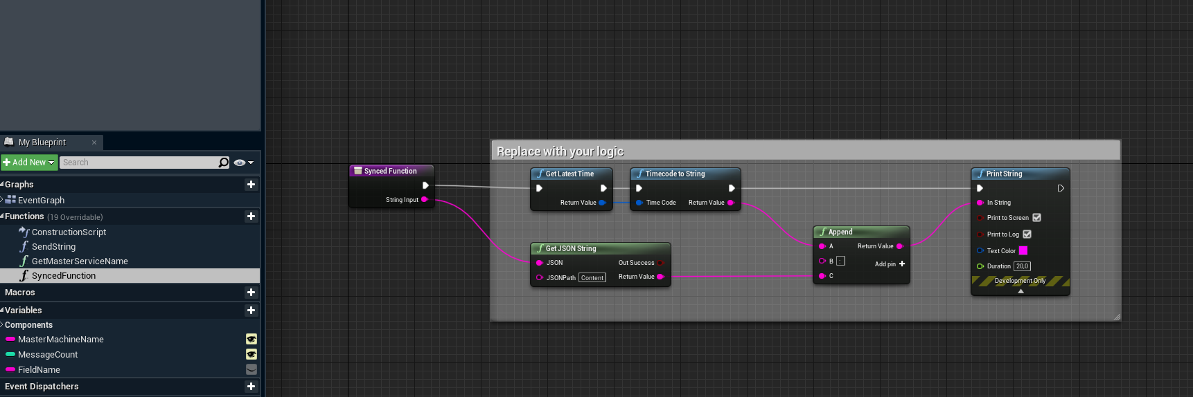 Right now it only prints current timecode and the string received, but this is the part you can replace with your logic.