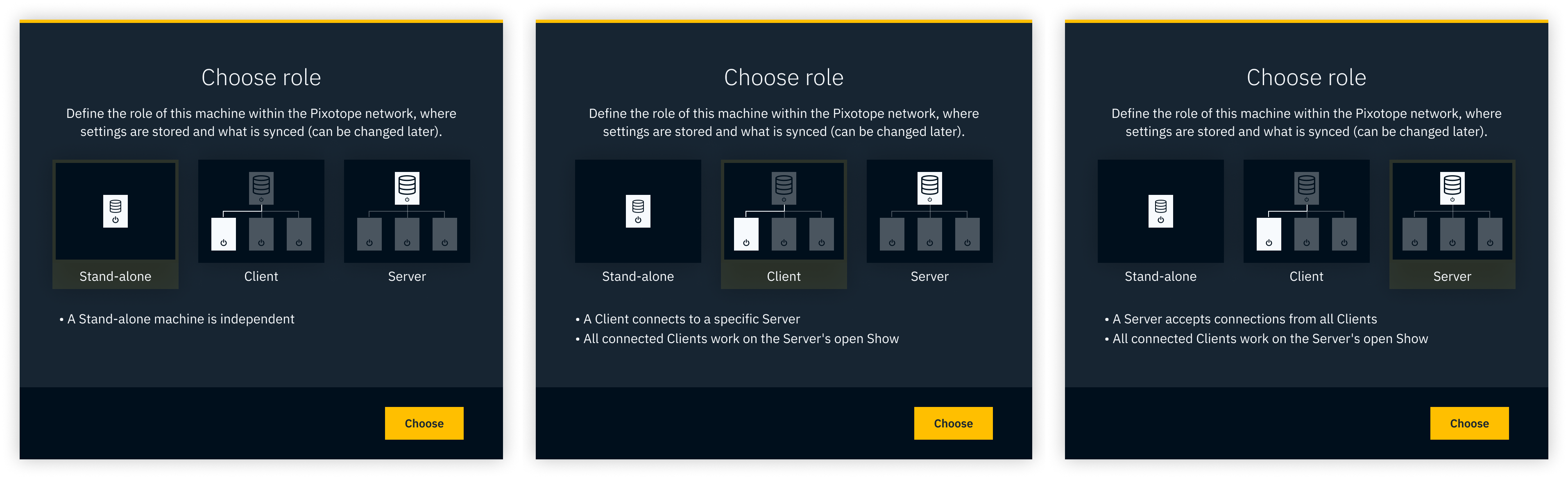 Roles are used to define the responsibility of a machine in a Pixotope network.