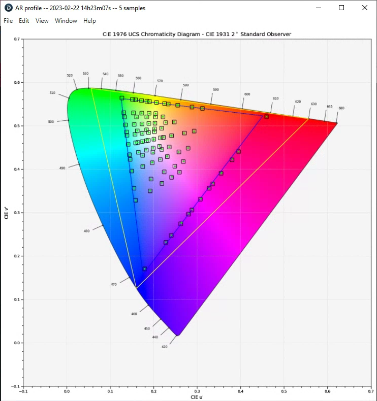 • Green dot is the position of the color patch in the Chromacity diagram after it is displayed on the LED screen, and was captured by the camera routed to the AR machine