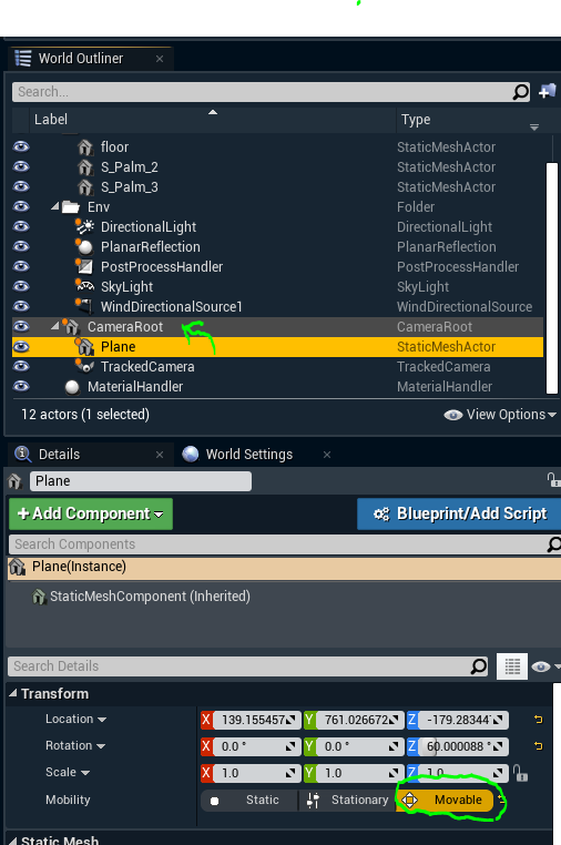 To put your object in the same coordinate system as the tracked camera, set it to “Movable“ and attach it to the “CameraRoot” actor in the World Outliner. Its position is now relative to the camera root, as is the “TrackedCamera”.