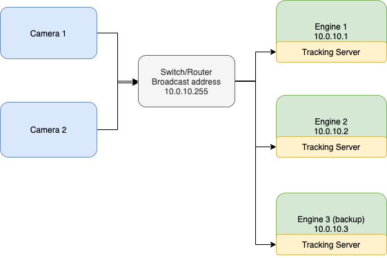 This is the simplest setup, with the fewest sources of problems. Here the Tracking Server must be configured to send tracking to the specific IPs of the engines. It is not possible to reroute tracking from camera 1 to engine 2 without changing the physical cabling.