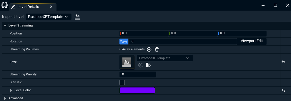 You can adjust the scale, position and rotation of the streamed level by clicking the “Summon level details” button in the “levels” window. We recommend adjusting the position and rotation of the streamed level rather than adjusting the camera root, since this will make it easier to add new graphics levels later.