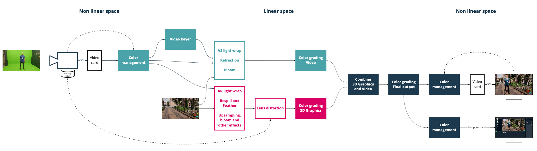All rendering and internal compositing is done inside Pixotope's customized render pipeline of the Unreal Engine. We have optimized the render pipeline to allow for very efficient single-pass rendering that does not compromise the quality of the video.