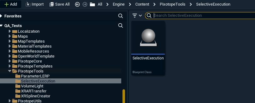 1. Find the actor “SelectiveExecution” in the content browser under Engine/Content/PixotopeTools/SelectiveExecution.