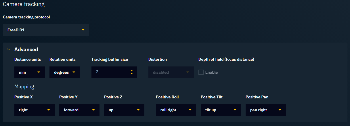 In the Director panel Configure->Tracking we can remap the tracking input to the direction we want. We tell Director where the axes point in the Incoming tracking data, allowing us to correctly map them to the correct axis orientation in our system. For most protocols, the default directions will be correct. If we need to, these mappings can be changed. In the example below we know that our FreeD tracking equipment has the following axis definitions in its tracking data: