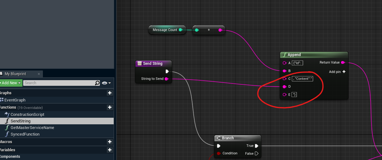 If your message is a JSON object, you need to remove the quotes around it in the Send String function, so it is parsed correctly.