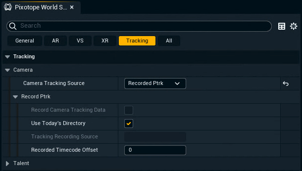 Set “Camera Tracking Source” to “Recorded Ptrk” in Pixotope World Settings > Tracking > Camera