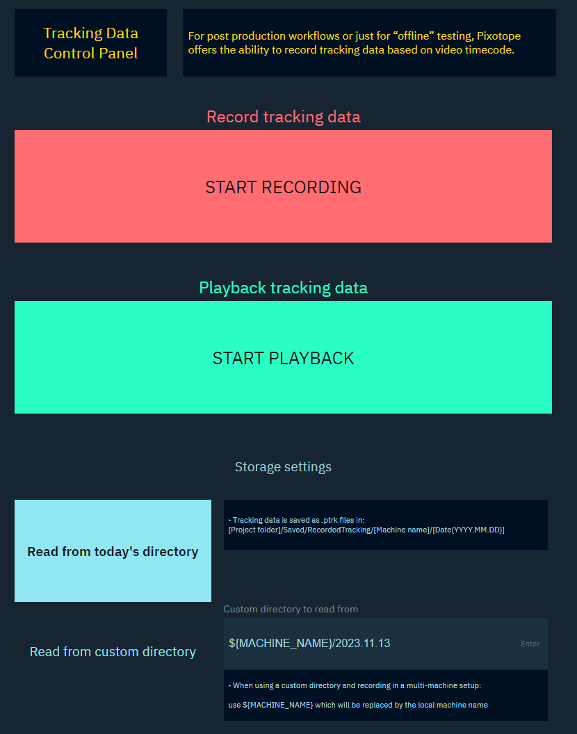 For post production workflows or just for “offline” testing, Pixotope offers the ability to record tracking data based on video timecode.