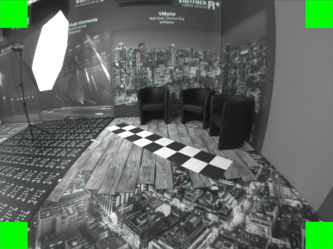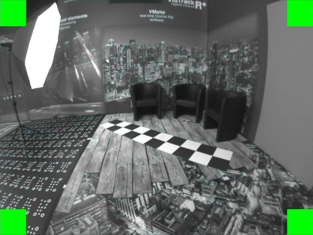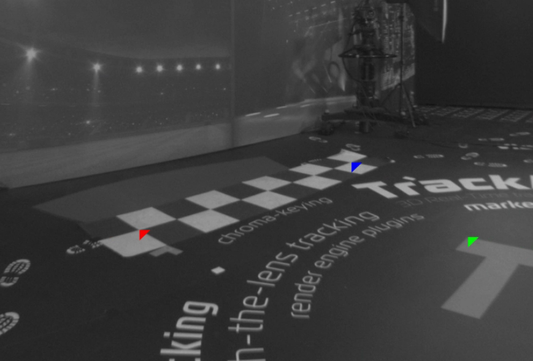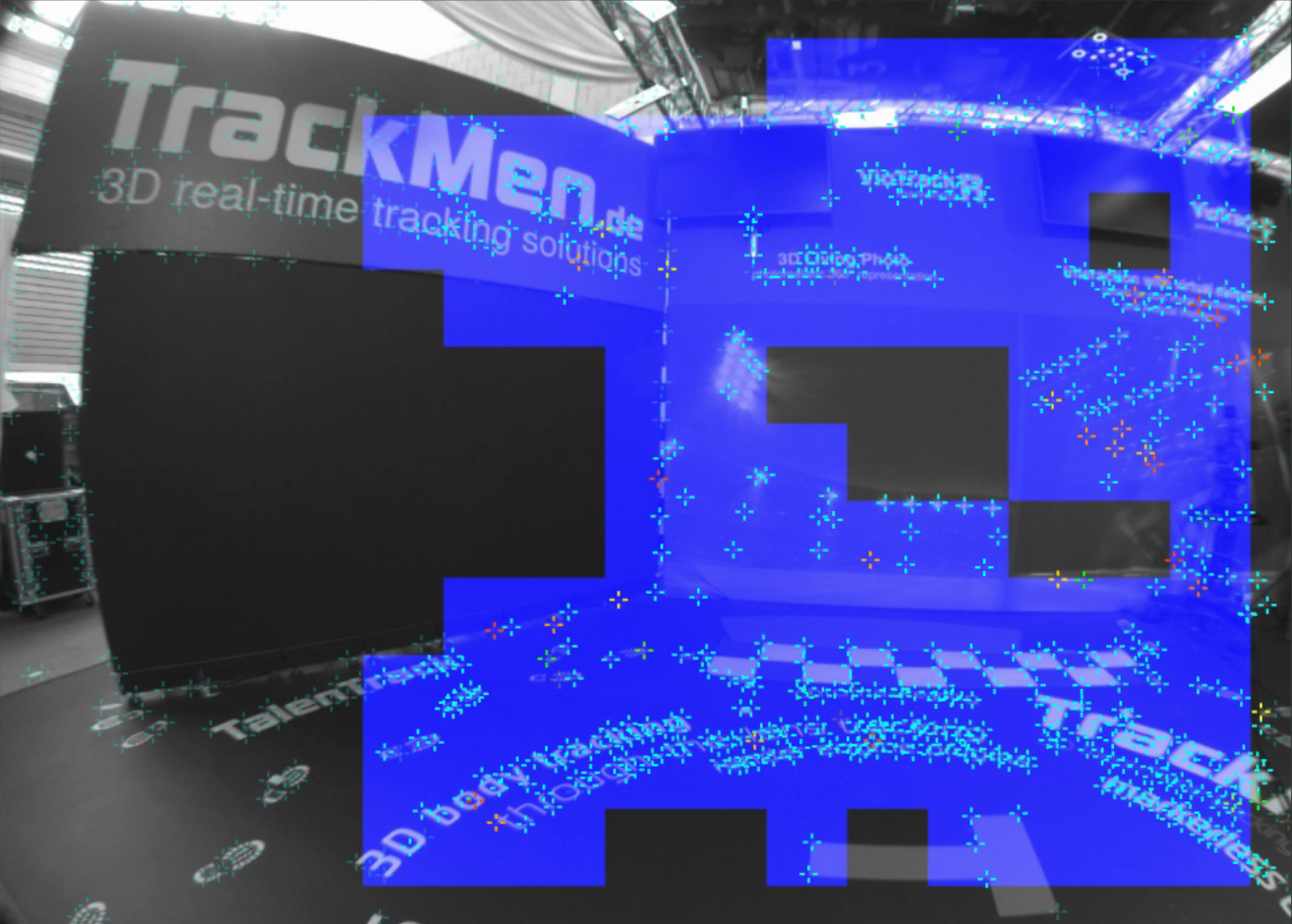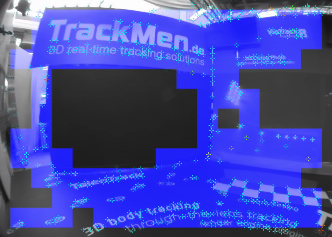 The image processing algorithm is based on the detection of high contrast corners. Two threshold values divide this detection into three different qualities of recognizability. These are called Score Threshold and Secondary score threshold. That means that the software detects features in the video with different qualities, depending on how well these features are recognizable. When activating Draw detection score in the Rendering tab, these differences become visible at the features in the video.