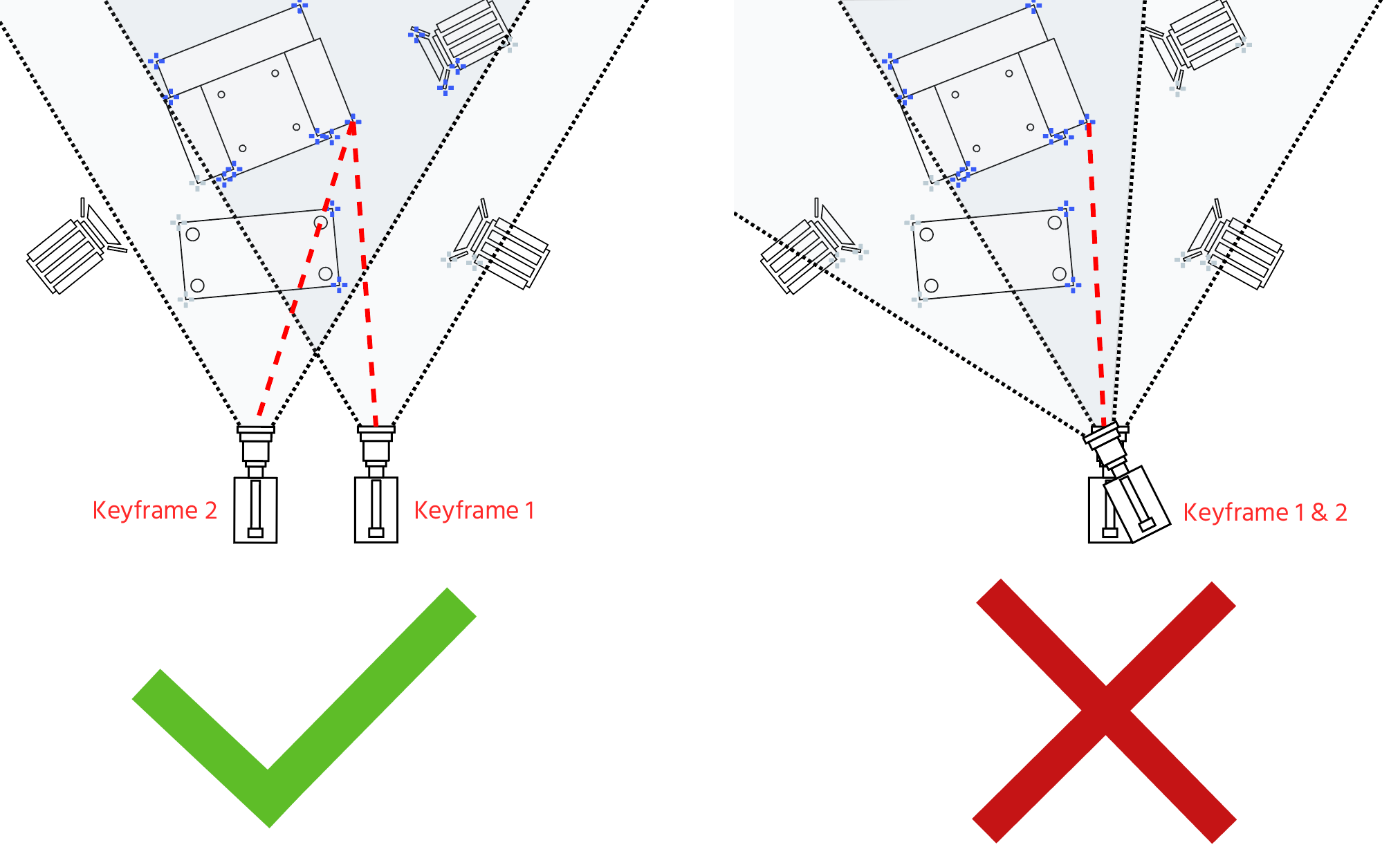 Keep in mind that every new or changed feature point has to be included in at least two new keyframes, which are taken from different perspectives.