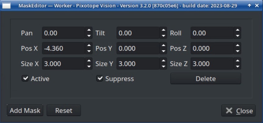 It is possible to create masks in the form of cuboid volumes inside the point cloud. All feature points that are located inside a mask volume will be disregarded and not recognized in the Worker video. The software will check for each feature point if it lies within one of the masks and if yes, exclude this feature point from the calculations.