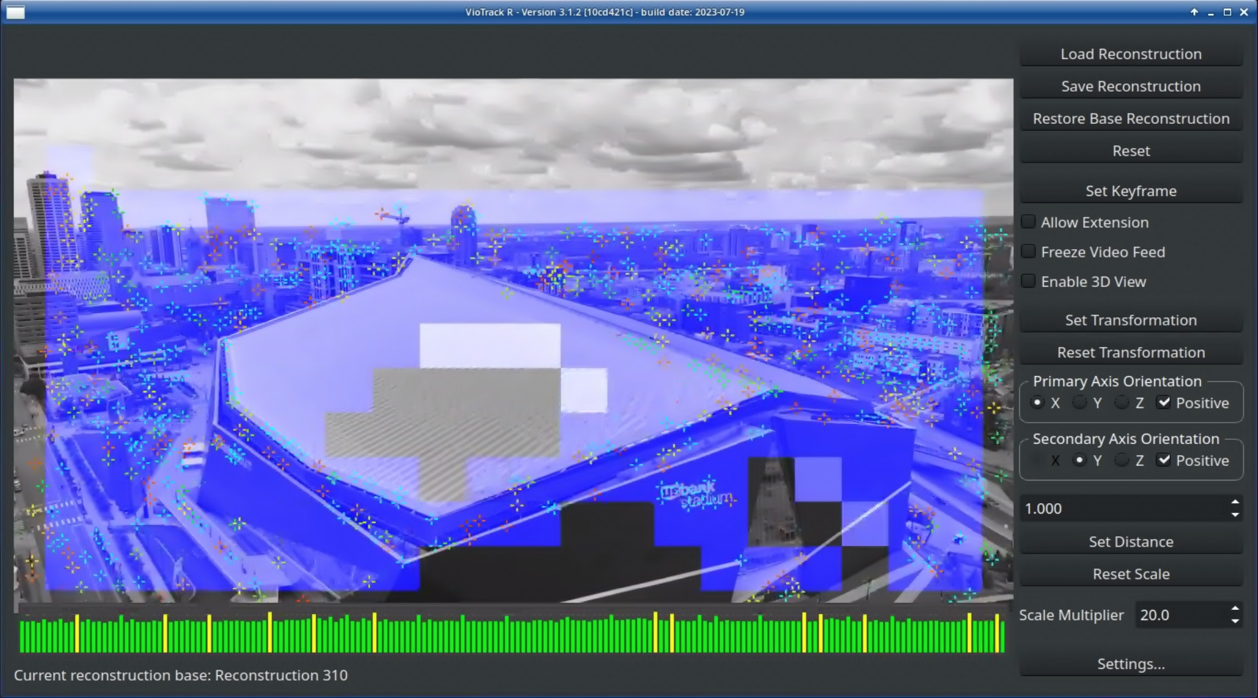 To start building a Reconstruction two keyframes are set manually from positions that are approximately half a meter apart. This creates the first 3D information. After this initialization, Allow Extension activates automatically and the camera just needs to be moved. The program notices changes in perspective and adds keyframes automatically, extending the point cloud.